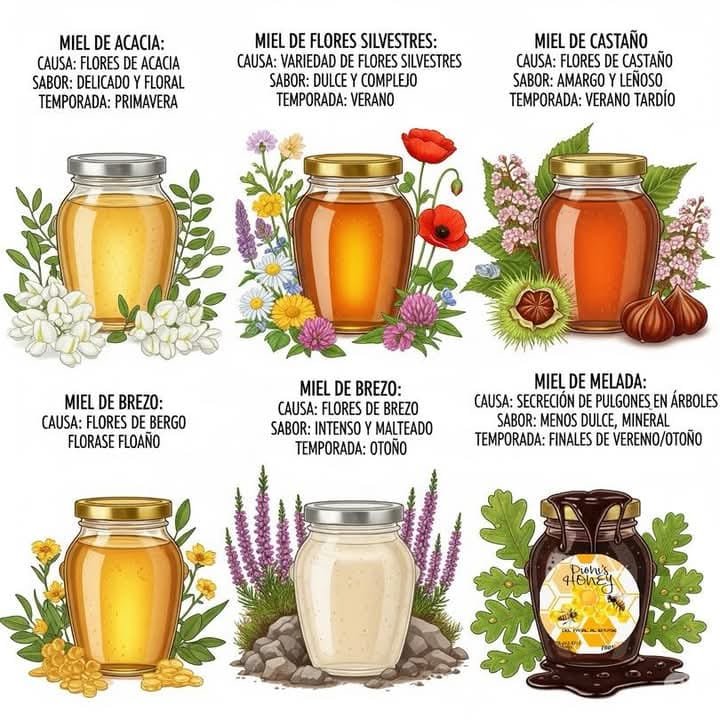 Peut être une image de médicaments et texte qui dit ’MIEL DE ACACIA: CAUSA: FLORES ACACIA SABOR: DELICADO FLORAL TEMPORADA: PRIMAVERA MIEL DE FLORES SILVESTRES: CAUSA: VARIEDAD DE FLORES SILVESTRES SABOR: DULCE ย TEMPORADA: VERANO MIEL DE CASTAÑO CAUSA: FLORES DE CASTAÑO SABOR: AMARGO LEÑOSO TEMPORADA: VERANO TARDIO MIEL DE BREZO: CAUSA: CAUSA:FLORES FLORES DE BERGO FLORASE FLOAÑO MIEL DE BREZO: CAUSA: FLORES BREZO SABOR: INTENSO ALTEADO TEMPORADA: OTOÑO MIEL DE MELADA: CAUSA: SECRECIÓN DE PULGONES ÁRBOLES SABOR: MENOS DULCE, MINERAL TEMPORADA: FINALES DE VERENN VERENNO/OTOÑO Honzy’
